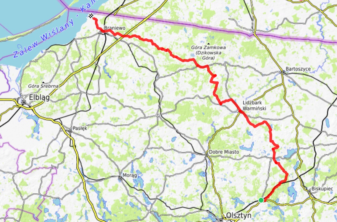 Trasa przebiegająca przez centralna Warmię, od Wenecji Północy (Barczewo) do Starej Pasłęki, po drodze mija Jeziorany, Lidzbark Warmiński, Braniewo. Trasa łatwa, po deszczu odcinki leśne mogą być błotne, ale generalnie sporo prostych, szybkich szutrów.