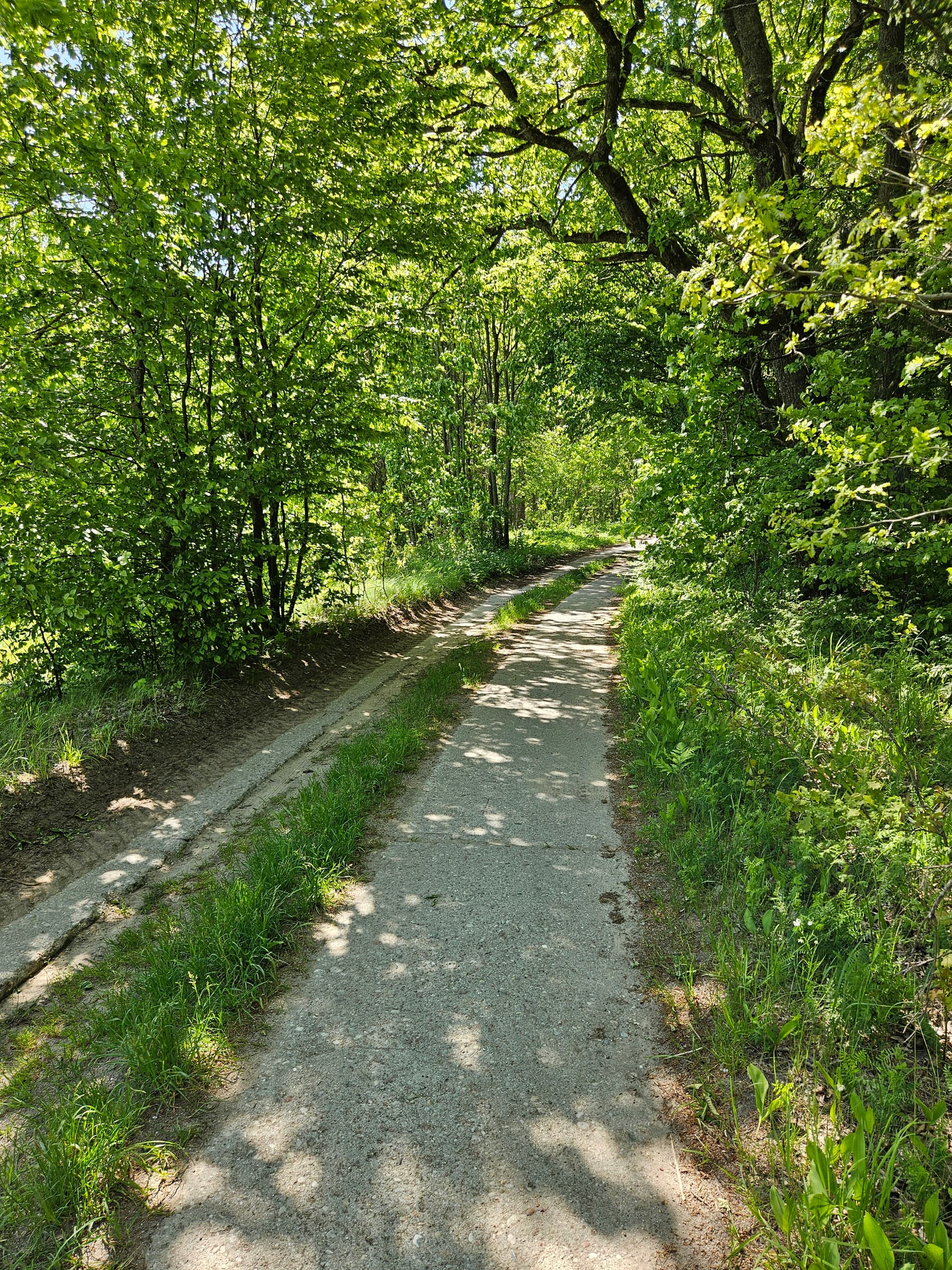 W miejscowości Żołędnik wjeżdżamy na drogę ułożoną z płyt betonowych, która prowadzi przez las. Na drodze widnieje zakaz wstępu ze względu na pozyskiwanie drewna, który możemy zignorować, gdyż jest już nieaktualny.
