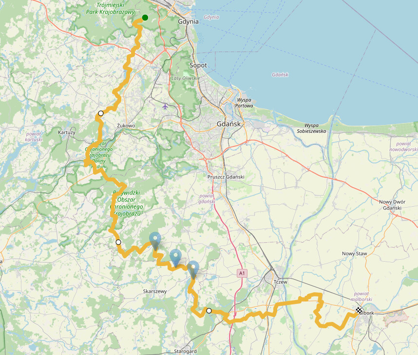 Trasa prowadzi z ogrodu botanicznego Marszewo niedaleko Gdyni pod zamek w Malborku, głównie szutry ale znajdzie się też parę błotnistych miejsc w lasach. Mniej więcej w środku trasy można znaleźć trzy ciekawe miejsca będziemy przejeżdżać koło pola golfowego (ciekawy widok) potem trafimy na tor-offroadowy prowadzony przez fundację off-road świat a potem po minięciu czynnej żwirowni znajdziemy następną już wyłączoną z użytku i wykorzystywaną przez okolicznych motocyklistów. Ogólnie trasa łatwa blisko Gdyni niestety dużo dróg jest wyłożone płytami ale później się rozkręca znajdą się nawet jakieś błotniste podjazdy.
