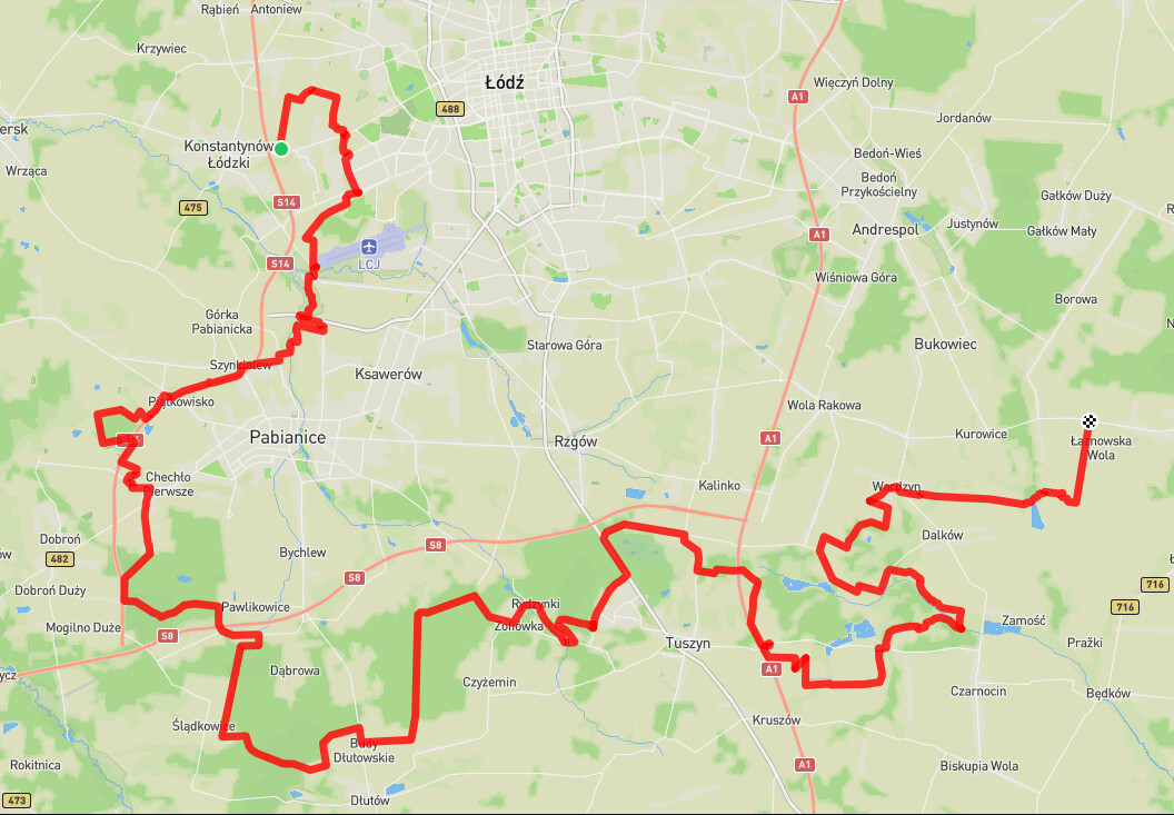 Start na parkingu Kaufland w Konstantynowie Łódzkim. Koniec przy ulicy Rokicińskiej w Łaznowskej Woli (łatwy dojazd do Łodzi).