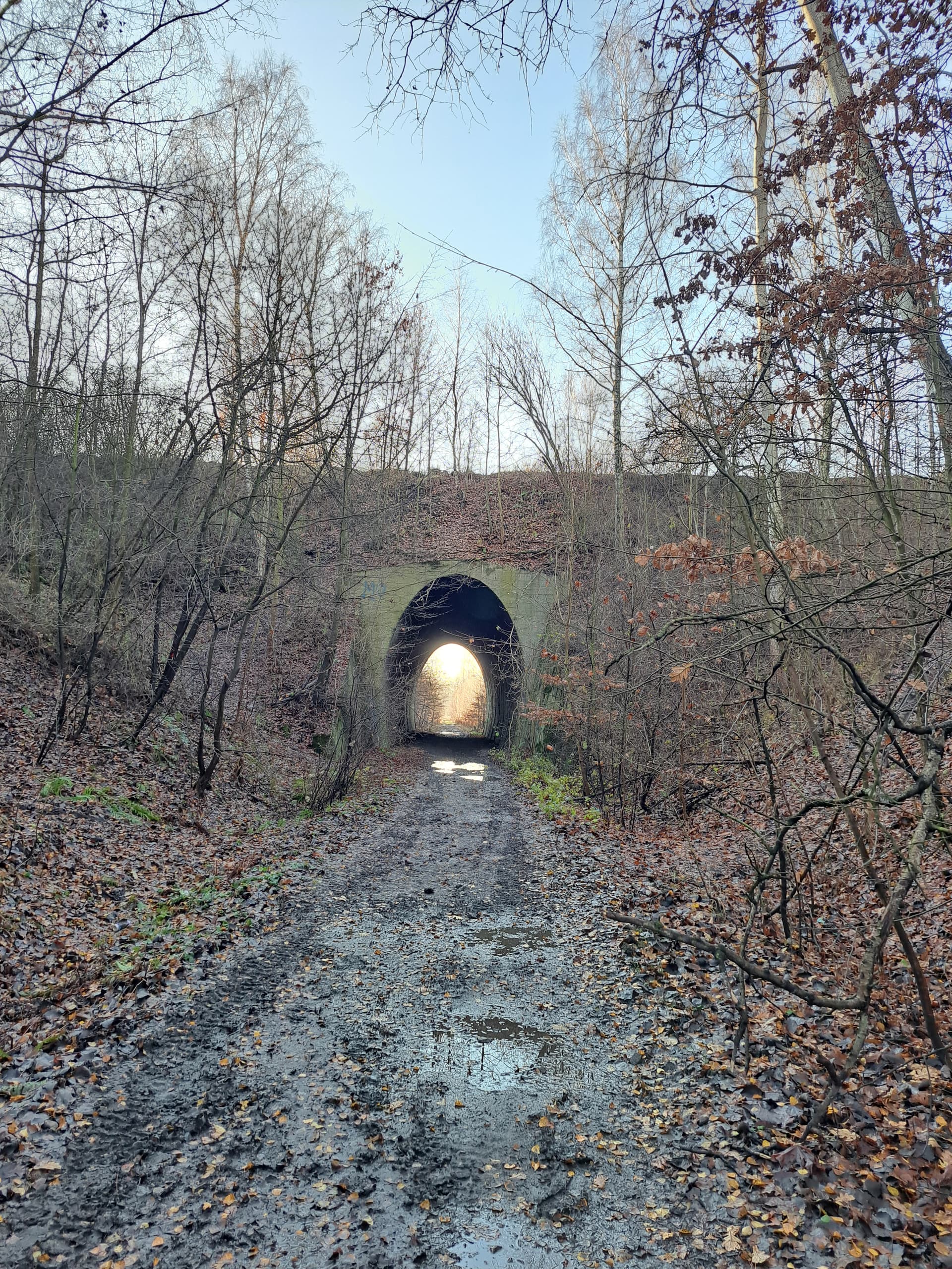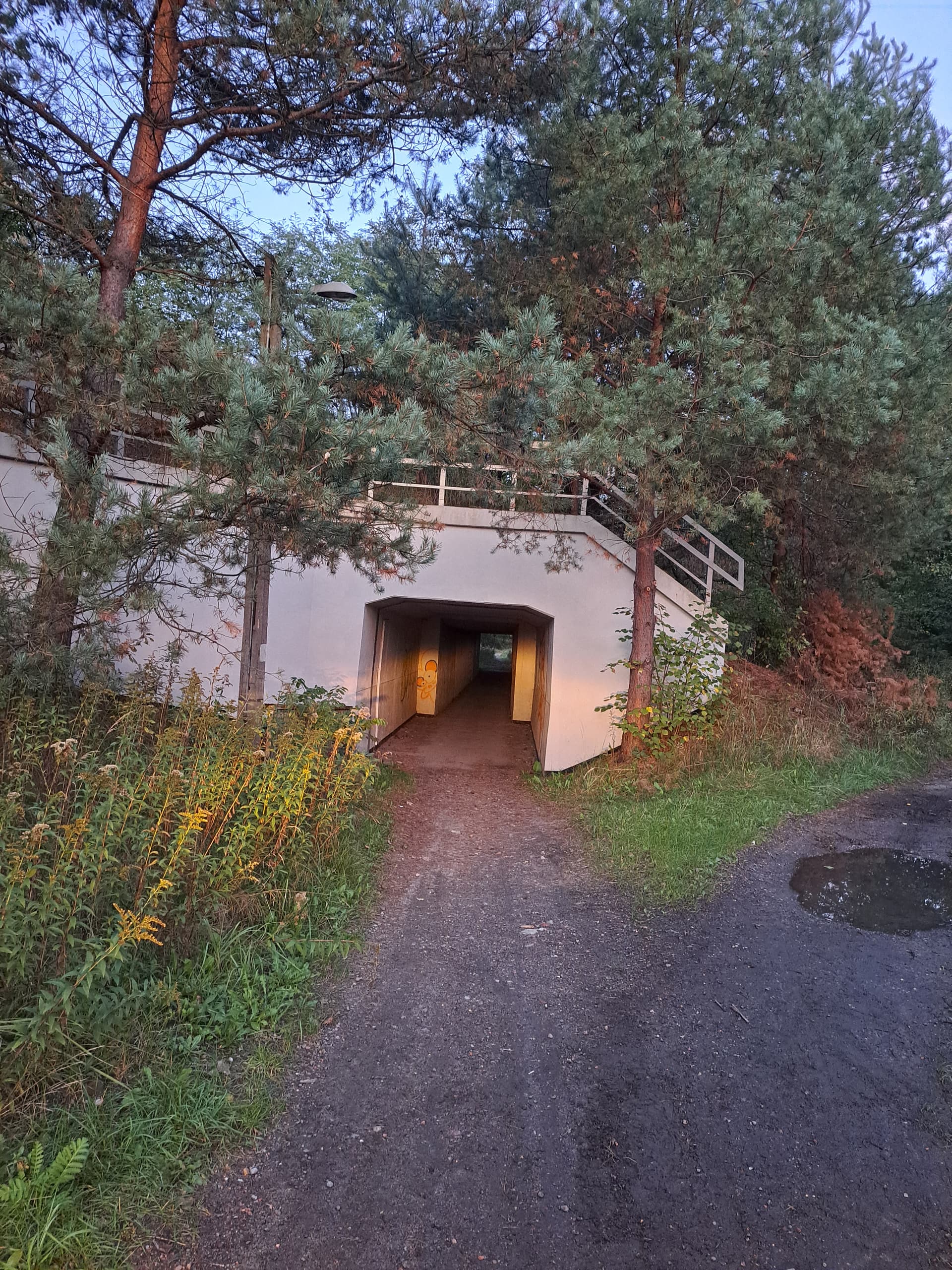 Korzystając z możliwości przedostania się przez czynne torowisko kolejowe tunelem zlikwidowanej kolei piaskowej omijamy przejazd kolejowy.